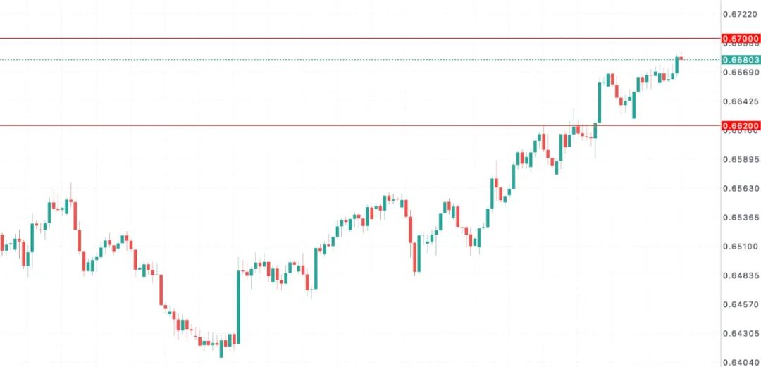 整体来看,澳美两国货币政策节奏的分化,预计将在短期内继续为澳币提供支撑。澳币也因此在周二刷新年内新高至0.6687价位水平,最低测试0.6557价位水平。